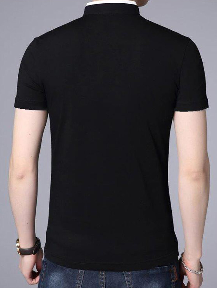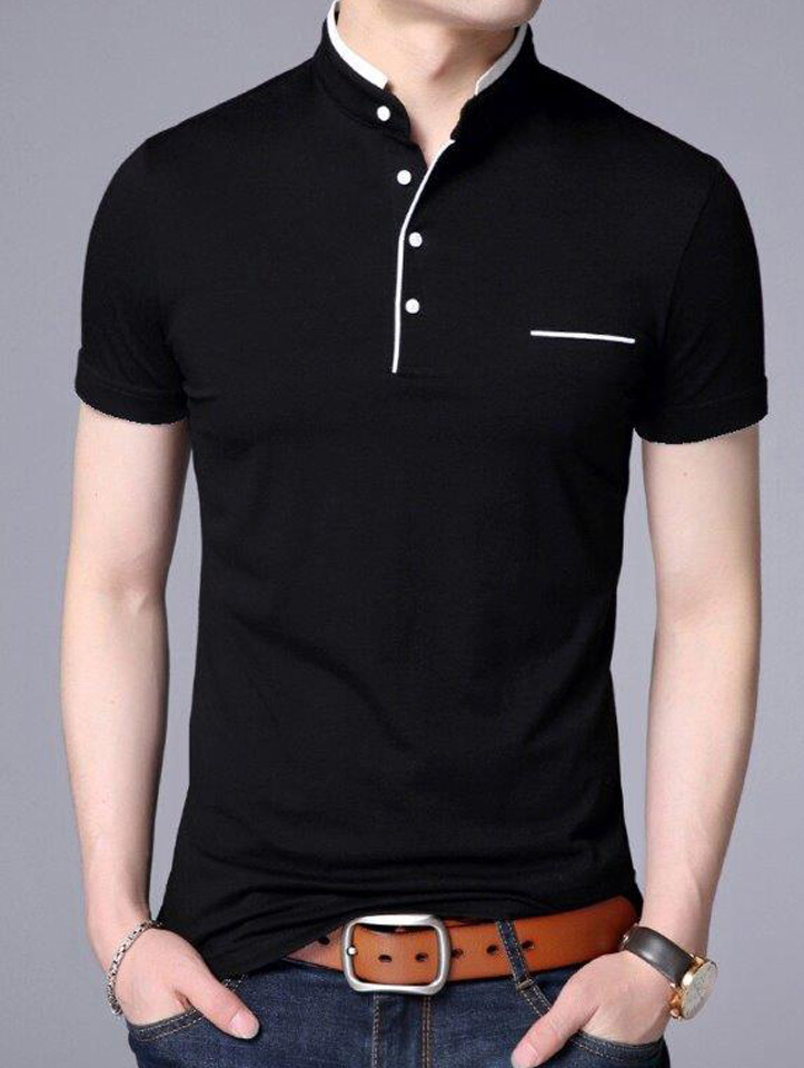 | Description | Band Collar T-shirt, Short Sleeves, Regular Fit, Placket with Buttons, Contrast Color Neck Band, Placket and Pocket Piping, Welt Pocket |
