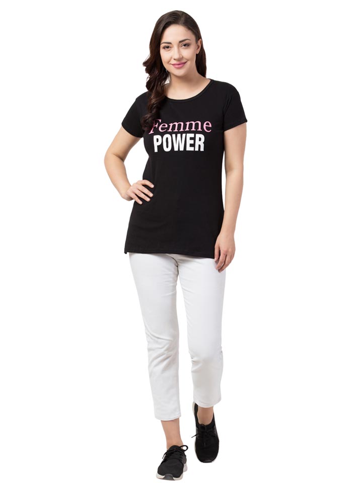 | Description | Printed Round Neck Femme Power T-Shirt, Regular Fit, Half Sleeve |